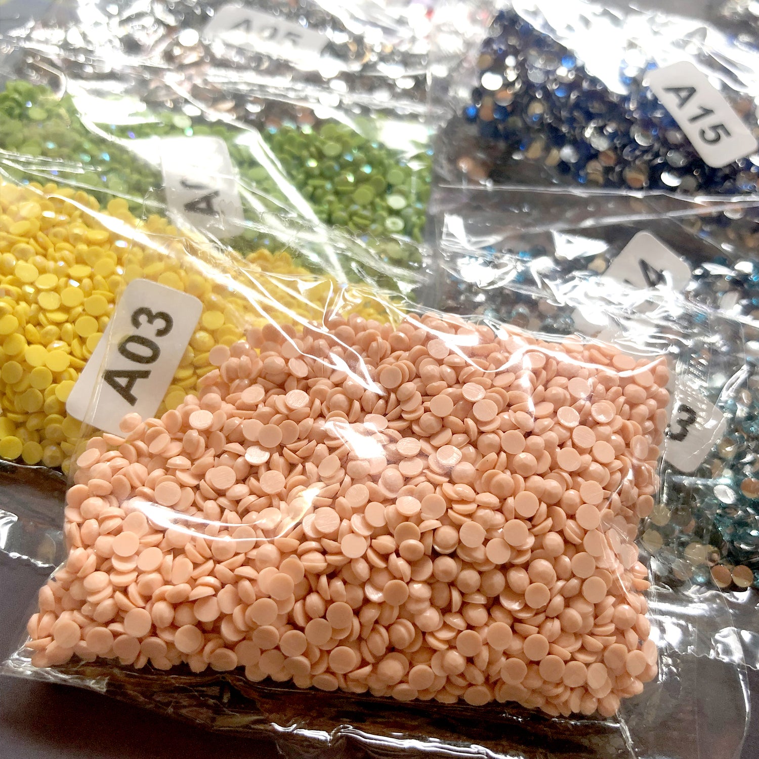 Farbige Harzdiamanten (verschiedene Farben in beschrifteten Tüten )