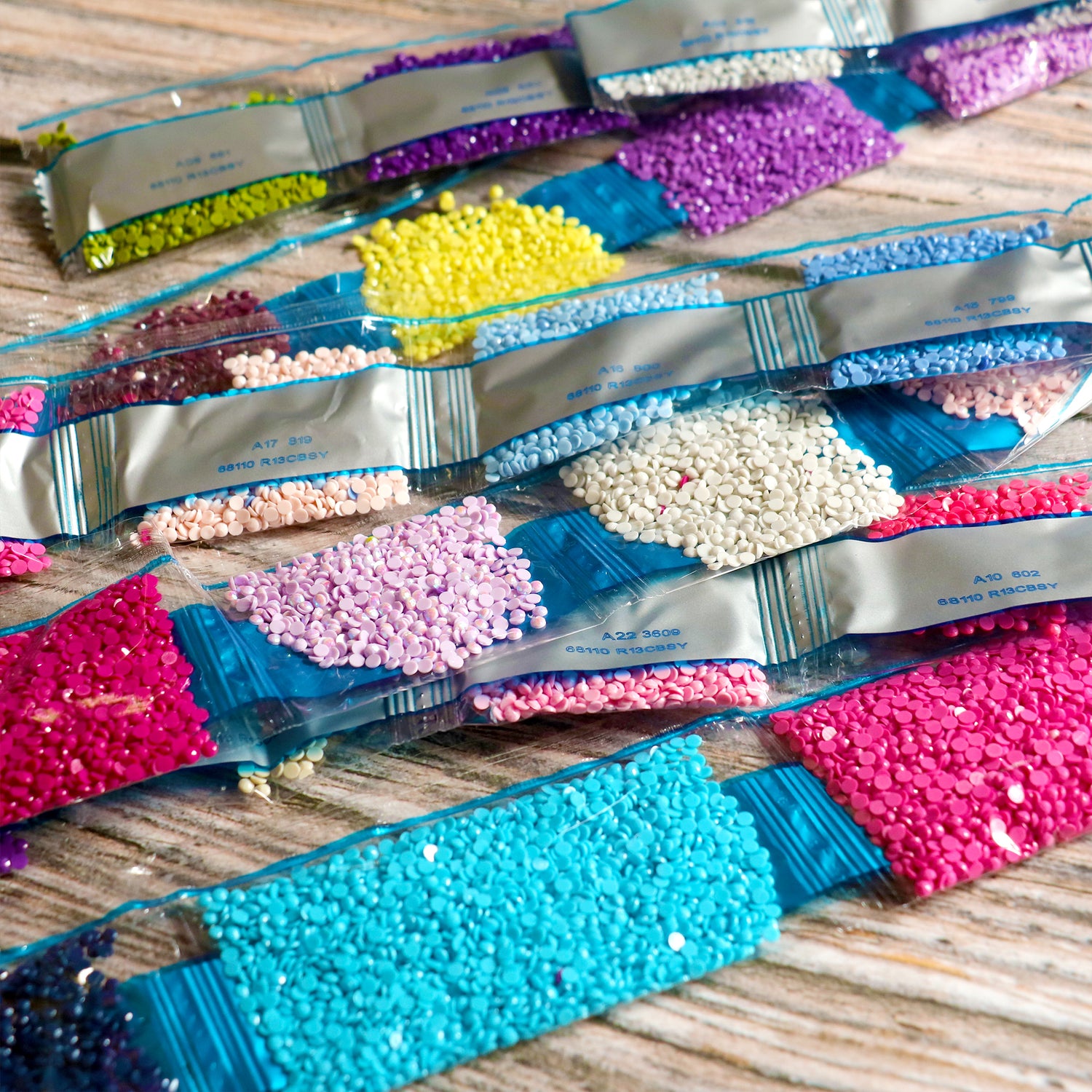 Diamants en résine colorée (différentes couleurs dans des sachets étiquetés)
